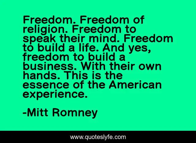 This page presents the quote "Freedom. Freedom of religion. Freedom to speak their mind. Freedom to build a life. And yes, freedom to build a business. With their own hands. This is the essence of the American experience.". Author of this quote is Mitt Romney. This quote is about freedom, life, experience,.
