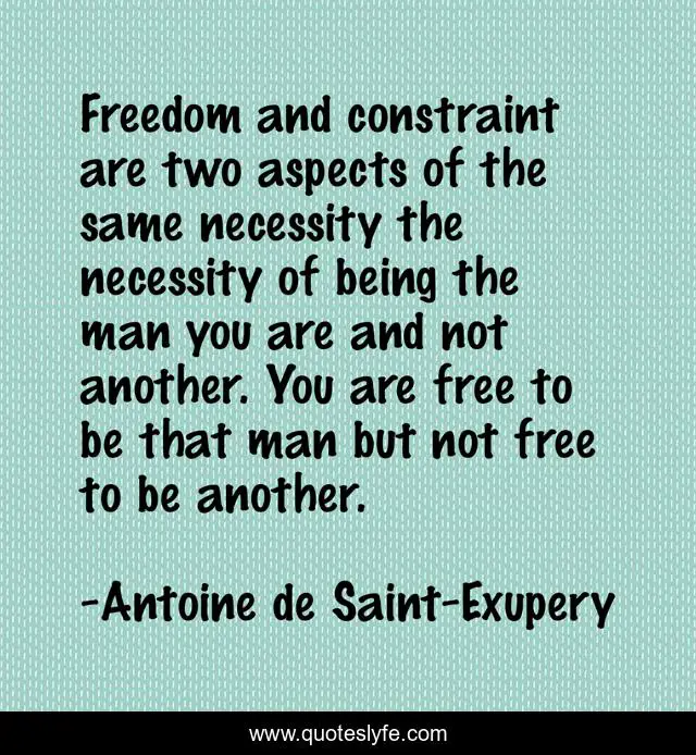 This page presents the quote "Freedom and constraint are two aspects of the same necessity the necessity of being the man you are and not another. You are free to be that man but not free to be another.". Author of this quote is Antoine de Saint-Exupery. .