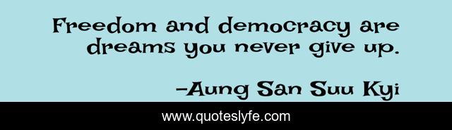 This page presents the quote "Freedom and democracy are dreams you never give up.". Author of this quote is Aung San Suu Kyi. This quote is about freedom, never give up,.