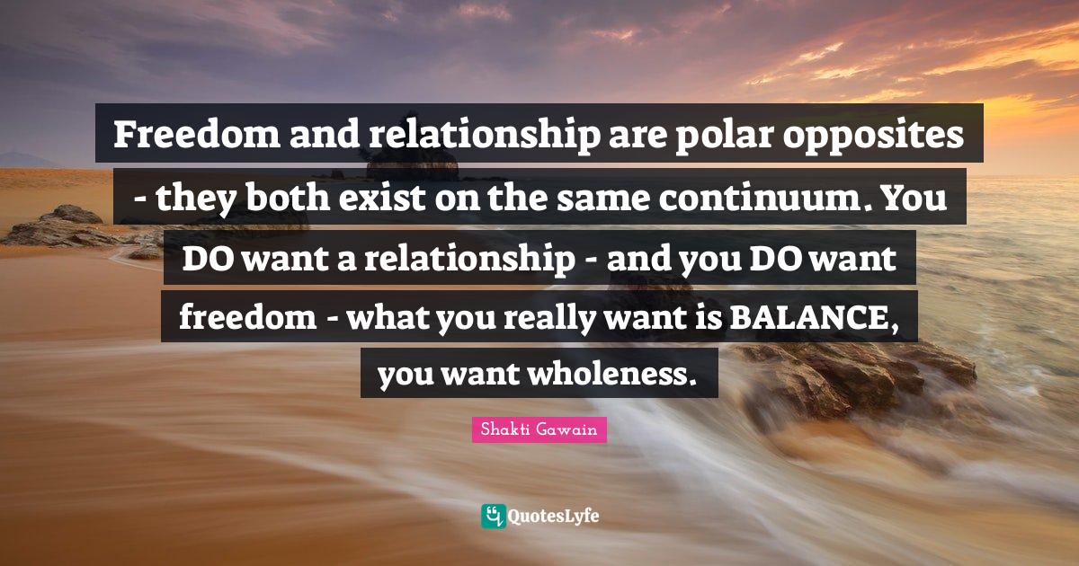This page presents the quote "Freedom and relationship are polar opposites - they both exist on the same continuum. You DO want a relationship - and you DO want freedom - what you really want is BALANCE, you want wholeness.". Author of this quote is Shakti Gawain. This quote is about freedom, relationship, opposites, continuum, want, balance, wholeness,.