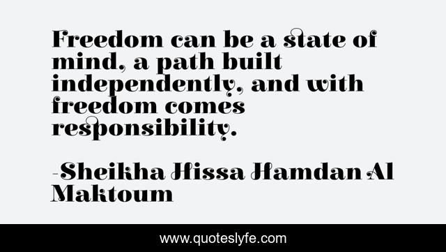This page presents the quote "Freedom can be a state of mind, a path built independently, and with freedom comes responsibility.". Author of this quote is Sheikha Hissa Hamdan Al Maktoum. This quote is about independency, freedom, mind, liberty, maturity, responsibility,.