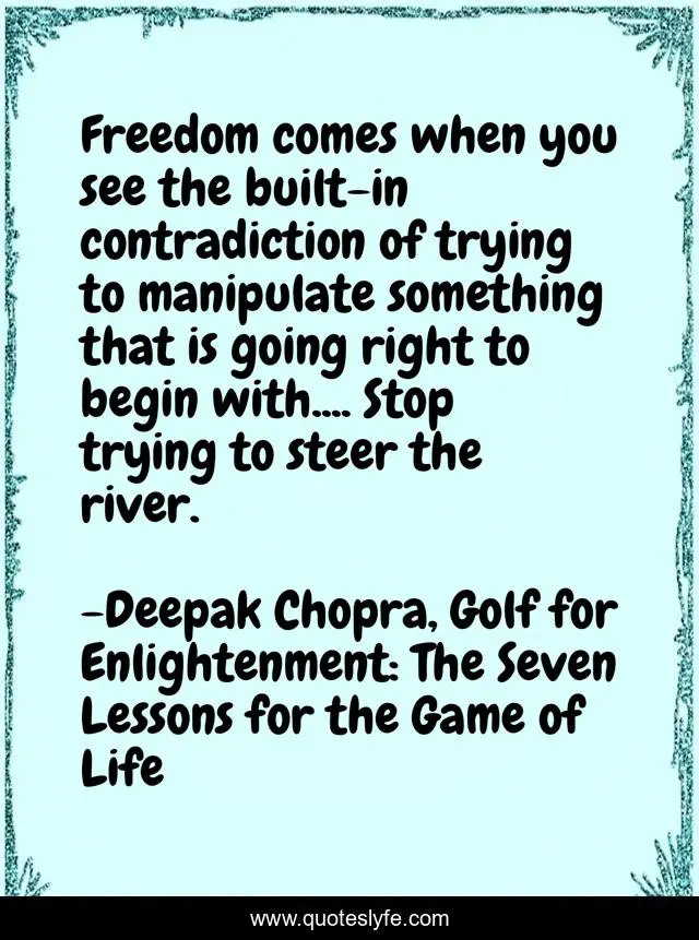 This page presents the quote "Freedom comes when you see the built-in contradiction of trying to manipulate something that is going right to begin with.... Stop trying to steer the river.". Author of this quote is Deepak Chopra, Golf for Enlightenment: The Seven Lessons for the Game of Life. This quote is about river-surrender, freedom,.