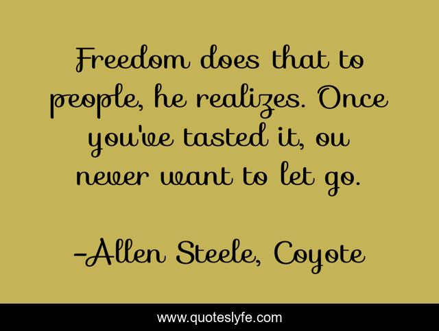This page presents the quote "Freedom does that to people, he realizes. Once you've tasted it, ou never want to let go.". Author of this quote is Allen Steele, Coyote. .