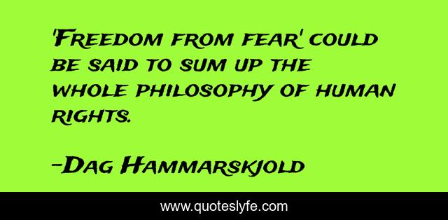 This page presents the quote "'Freedom from fear' could be said to sum up the whole philosophy of human rights.". Author of this quote is Dag Hammarskjold. This quote is about freedom, philosophy, rights,.