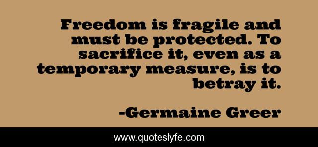 This page presents the quote "Freedom is fragile and must be protected. To sacrifice it, even as a temporary measure, is to betray it.". Author of this quote is Germaine Greer. This quote is about sacrifice, fragile, measure,.