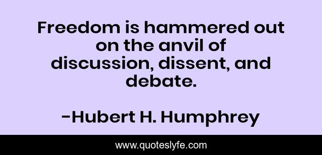 This page presents the quote "Freedom is hammered out on the anvil of discussion, dissent, and debate.". Author of this quote is Hubert H. Humphrey. This quote is about dissent, discussion, debate,.