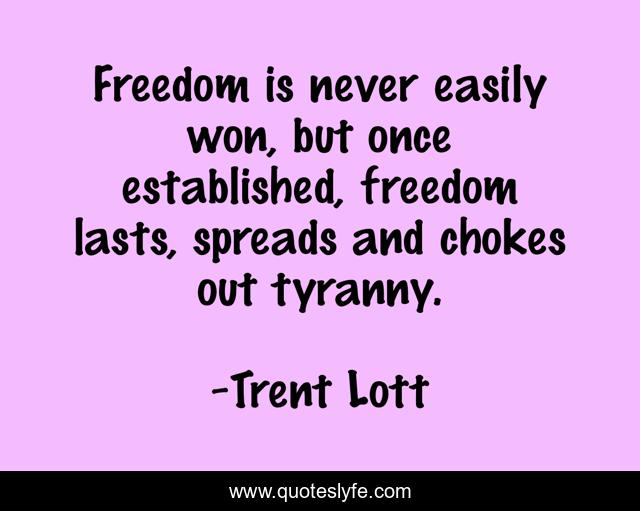 This page presents the quote "Freedom is never easily won, but once established, freedom lasts, spreads and chokes out tyranny.". Author of this quote is Trent Lott. This quote is about tyranny, established,.
