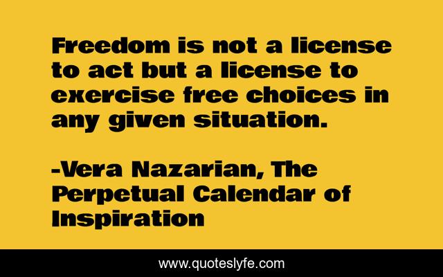 "Vera Nazarian, The Perpetual Calendar of Inspiration Quotes." Quoteslyfe.com, 2025. Sat. 06 Dec. 2025. <https://www.quoteslyfe.com/quote/Freedom-is-not-a-license-to-act-54444>.