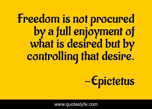 This page presents the quote "Freedom is not procured by a full enjoyment of what is desired but by controlling that desire.". Author of this quote is Epictetus. This quote is about control, self,.