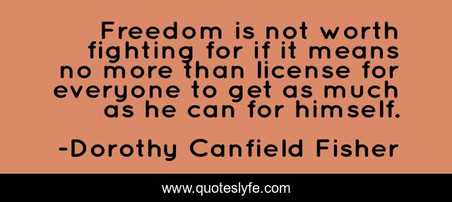 This page presents the quote "Freedom is not worth fighting for if it means no more than license for everyone to get as much as he can for himself.". Author of this quote is Dorothy Canfield Fisher. This quote is about everyone, worth, fighting,.
