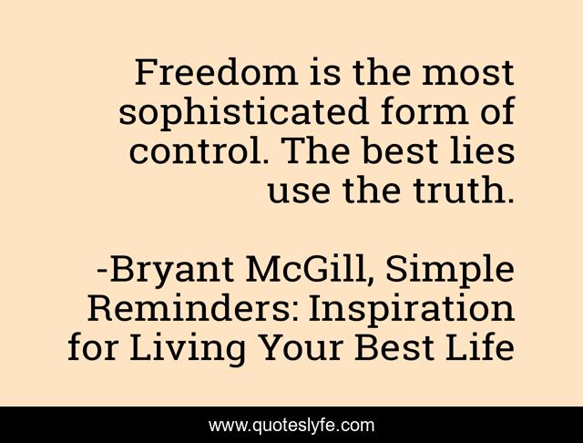 This page presents the quote "Freedom is the most sophisticated form of control. The best lies use the truth.". Author of this quote is Bryant McGill, Simple Reminders: Inspiration for Living Your Best Life. This quote is about control, freedom, lies, truth, sophistication,.