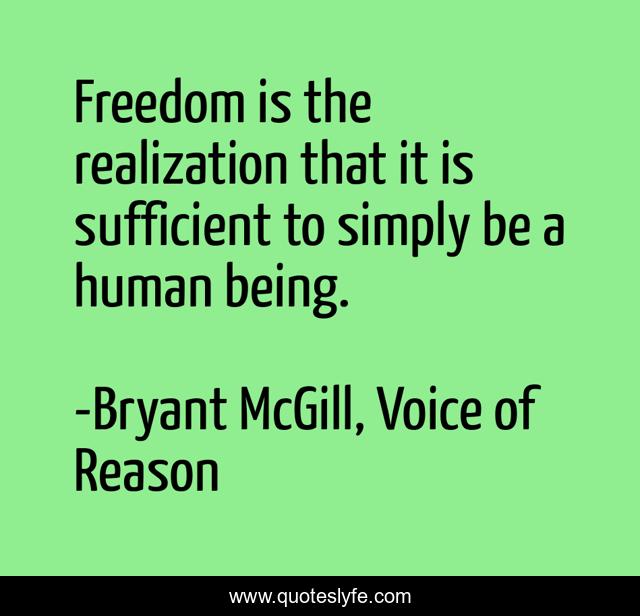 This page presents the quote "Freedom is the realization that it is sufficient to simply be a human being.". Author of this quote is Bryant McGill, Voice of Reason. This quote is about importance, freedom, individualism, simplicity,.