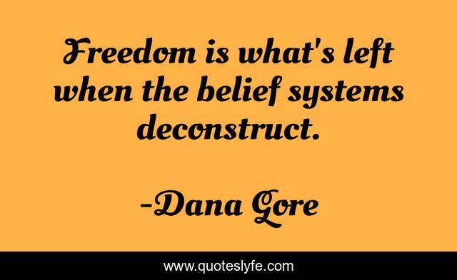 This page presents the quote "Freedom is what's left when the belief systems deconstruct.". Author of this quote is Dana Gore. This quote is about belief-systems, freedom, awareness,.
