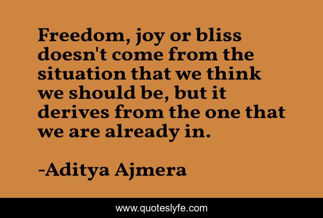 This page presents the quote "Freedom, joy or bliss doesn't come from the situation that we think we should be, but it derives from the one that we are already in.". Author of this quote is Aditya Ajmera. This quote is about freedom, joy, present-moment, bliss,.