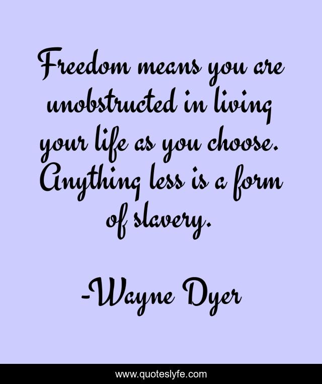 This page presents the quote "Freedom means you are unobstructed in living your life as you choose. Anything less is a form of slavery.". Author of this quote is Wayne Dyer. This quote is about living, life, slavery,.