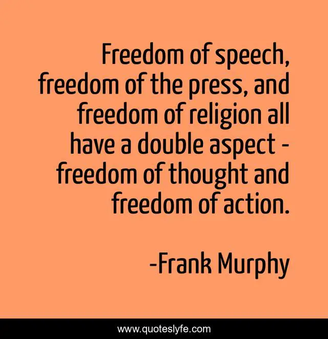 This page presents the quote "Freedom of speech, freedom of the press, and freedom of religion all have a double aspect - freedom of thought and freedom of action.". Author of this quote is Frank Murphy. This quote is about thought, freedom, action,.