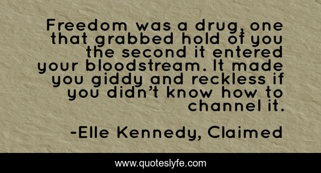 This page presents the quote "Freedom was a drug, one that grabbed hold of you the second it entered your bloodstream. It made you giddy and reckless if you didn’t know how to channel it.". Author of this quote is Elle Kennedy, Claimed. .