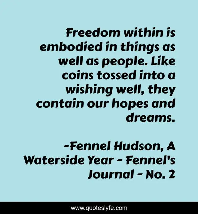 This page presents the quote "Freedom within is embodied in things as well as people. Like coins tossed into a wishing well, they contain our hopes and dreams.". Author of this quote is Fennel Hudson, A Waterside Year - Fennel's Journal - No. 2. This quote is about freedom-within, hopes-and-dreams, identity,.