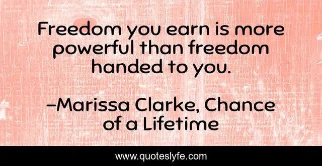 This page presents the quote "Freedom you earn is more powerful than freedom handed to you.". Author of this quote is Marissa Clarke, Chance of a Lifetime. This quote is about marissa-clarke, contemporary-romance, category-romance, blindness, entangled-lovestruck, series-romance,.