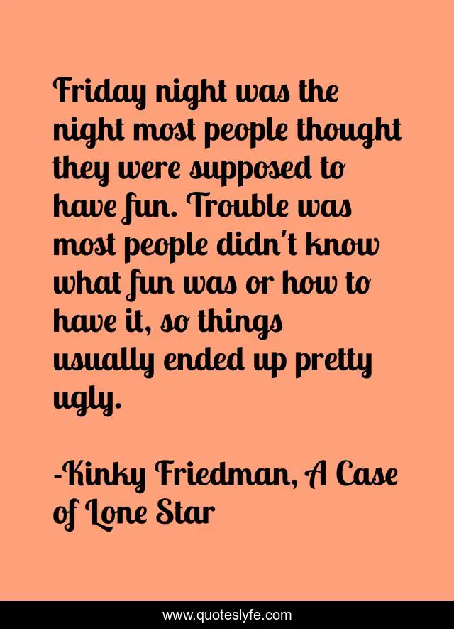 This page presents the quote "Friday night was the night most people thought they were supposed to have fun. Trouble was most people didn't know what fun was or how to have it, so things usually ended up pretty ugly.". Author of this quote is Kinky Friedman, A Case of Lone Star. This quote is about entertainment, humour, people,.
