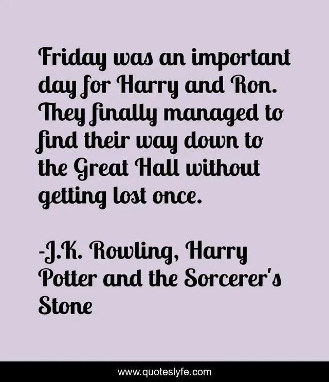 This page presents the quote "Friday was an important day for Harry and Ron. They finally managed to find their way down to the Great Hall without getting lost once.". Author of this quote is J.K. Rowling, Harry Potter and the Sorcerer's Stone. .