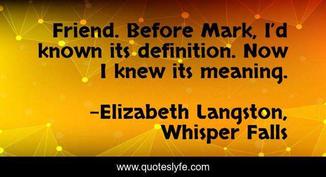 This page presents the quote "Friend. Before Mark, I’d known its definition. Now I knew its meaning.". Author of this quote is Elizabeth Langston, Whisper Falls. This quote is about friendship, friend,.