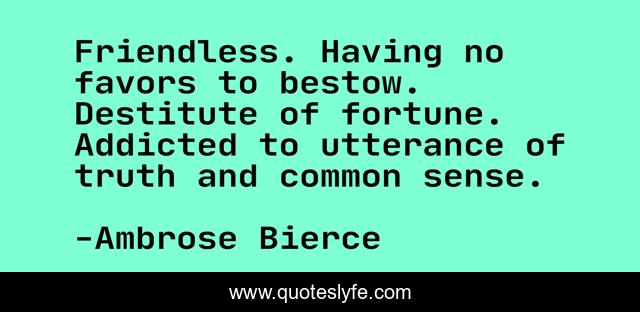 This page presents the quote "Friendless. Having no favors to bestow. Destitute of fortune. Addicted to utterance of truth and common sense.". Author of this quote is Ambrose Bierce. This quote is about common sense, fortune, sense,.