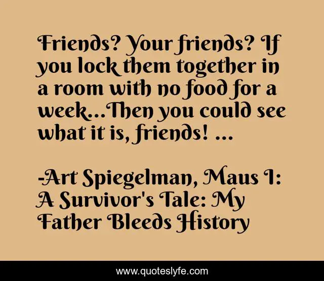 This page presents the quote "Friends? Your friends? If you lock them together in a room with no food for a week…Then you could see what it is, friends! …". Author of this quote is Art Spiegelman, Maus I: A Survivor's Tale: My Father Bleeds History. .