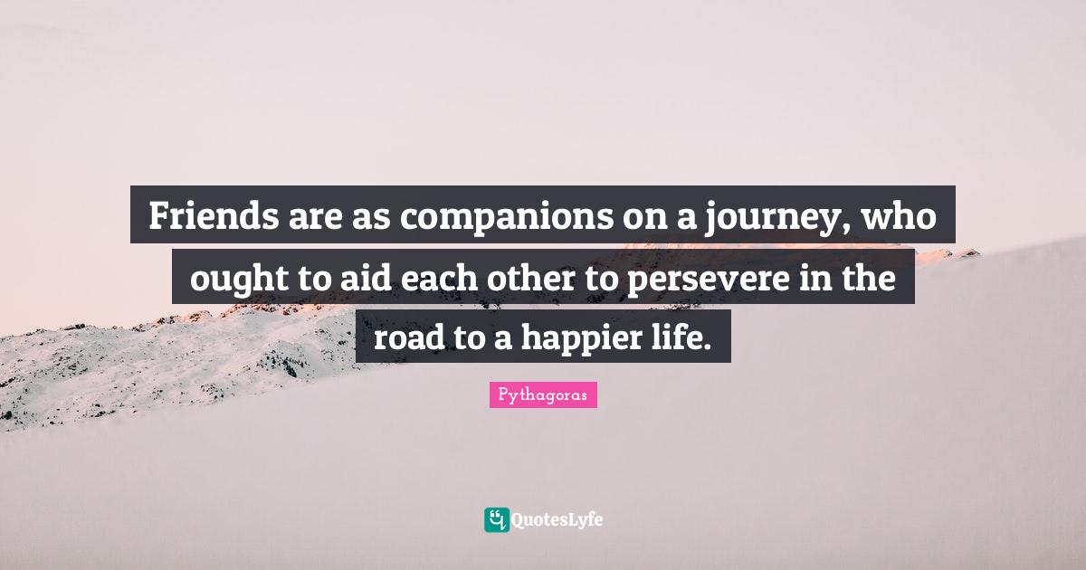 This page presents the quote "Friends are as companions on a journey, who ought to aid each other to persevere in the road to a happier life.". Author of this quote is Pythagoras. This quote is about happier life, friends, happy life, friendship, persevere, journey, ought,.