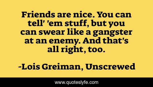 This page presents the quote "Friends are nice. You can tell' 'em stuff, but you can swear like a gangster at an enemy. And that's all right, too.". Author of this quote is Lois Greiman, Unscrewed. This quote is about mystery, chick-lit, humor,.