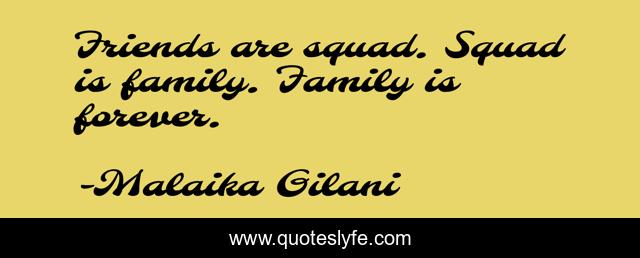 This page presents the quote "Friends are squad. Squad is family. Family is forever.". Author of this quote is Malaika Gilani. This quote is about forever, friendship, family,.