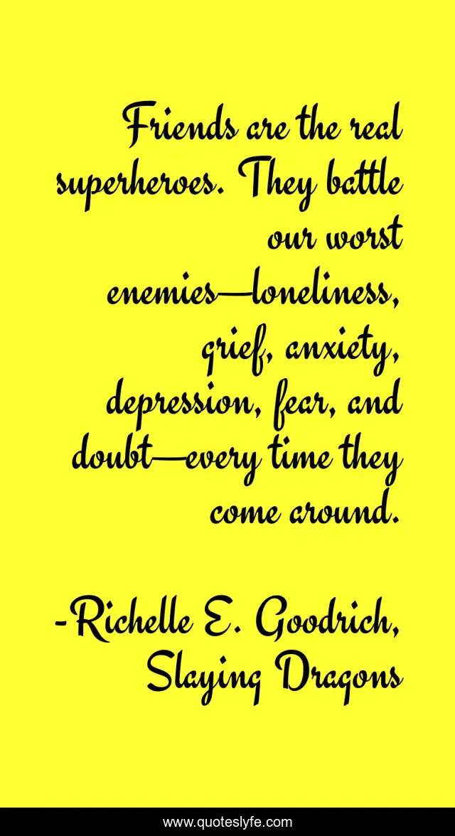 This page presents the quote "Friends are the real superheroes. They battle our worst enemies—loneliness, grief, anxiety, depression, fear, and doubt—every time they come around.". Author of this quote is Richelle E. Goodrich, Slaying Dragons. This quote is about anxiety, hero, richelle-e-goodrich, loneliness, friends, grief, doubt, richelle, depression,.