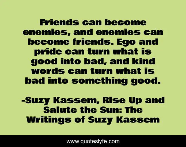 This page presents the quote "Friends can become enemies, and enemies can become friends. Ego and pride can turn what is good into bad, and kind words can turn what is bad into something good.". Author of this quote is Suzy Kassem, Rise Up and Salute the Sun: The Writings of Suzy Kassem. This quote is about relationship-love, enemies, relationships, enemies-to-friends, friends-to-enemies, pride, friend, life, good,.