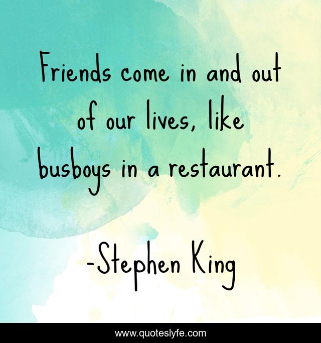 This page presents the quote "Friends come in and out of our lives, like busboys in a restaurant.". Author of this quote is Stephen King. .