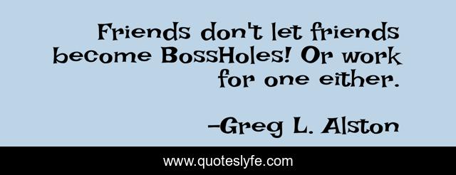 This page presents the quote "Friends don't let friends become BossHoles! Or work for one either.". Author of this quote is Greg L. Alston. .