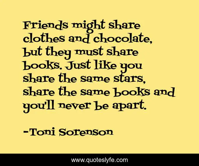 This page presents the quote "Friends might share clothes and chocolate, but they must share books. Just like you share the same stars, share the same books and you'll never be apart.". Author of this quote is Toni Sorenson. .