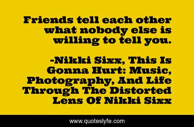"Nikki Sixx, This Is Gonna Hurt: Music, Photography, And Life Through The Distorted Lens Of Nikki Sixx Quotes." Quoteslyfe.com, 2025. Sat. 06 Dec. 2025. <https://www.quoteslyfe.com/quote/Friends-tell-each-other-what-nobody-else-50341>.