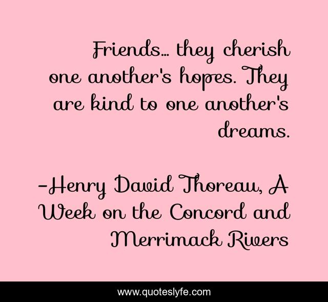 This page presents the quote "Friends... they cherish one another's hopes. They are kind to one another's dreams.". Author of this quote is Henry David Thoreau, A Week on the Concord and Merrimack Rivers. This quote is about friends, friendship,.