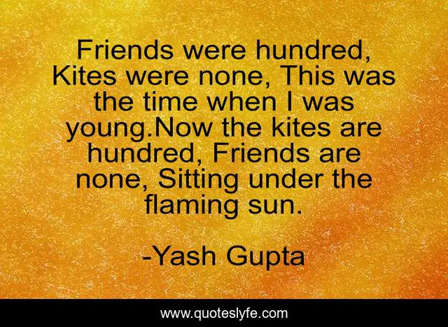 This page presents the quote "Friends were hundred, Kites were none, This was the time when I was young.Now the kites are hundred, Friends are none, Sitting under the flaming sun.". Author of this quote is Yash Gupta. This quote is about friends, loneliness, friendship, kites,.