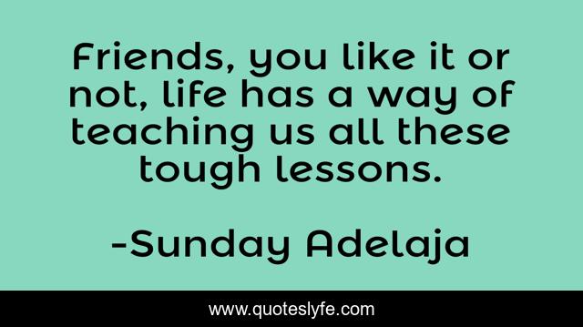 This page presents the quote "Friends, you like it or not, life has a way of teaching us all these tough lessons.". Author of this quote is Sunday Adelaja. This quote is about lesson, teach, friend,.