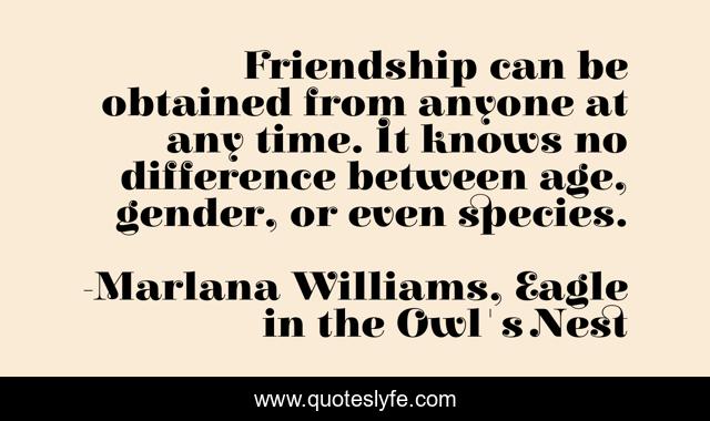 This page presents the quote "Friendship can be obtained from anyone at any time. It knows no difference between age, gender, or even species.". Author of this quote is Marlana Williams, Eagle in the Owl's Nest. .