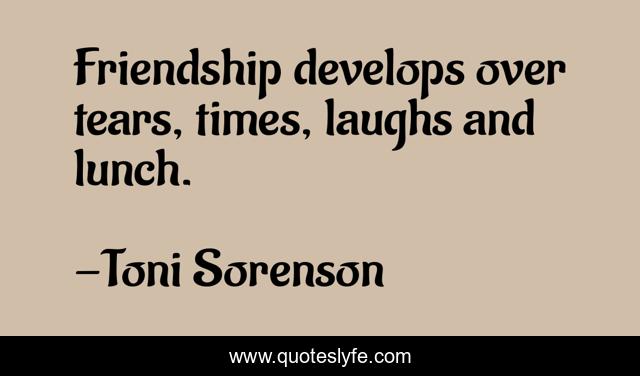 This page presents the quote "Friendship develops over tears, times, laughs and lunch.". Author of this quote is Toni Sorenson. .