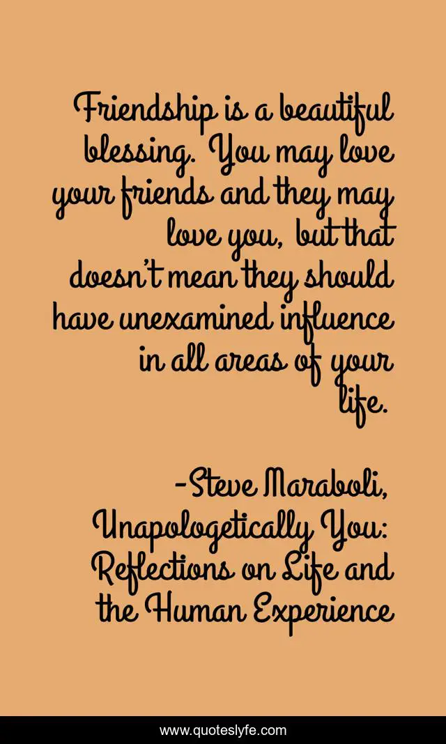 This page presents the quote "Friendship is a beautiful blessing. You may love your friends and they may love you, but that doesn’t mean they should have unexamined influence in all areas of your life.". Author of this quote is Steve Maraboli, Unapologetically You: Reflections on Life and the Human Experience. This quote is about friends, life, friendship,.