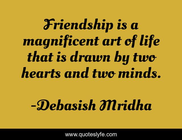 This page presents the quote "Friendship is a magnificent art of life that is drawn by two hearts and two minds.". Author of this quote is Debasish Mridha. This quote is about art-of-life, two-hearts, philosophy, debasish-mridha, quotes, two-minds, debasish-mridha-md, inspirational, enthusiasm,.