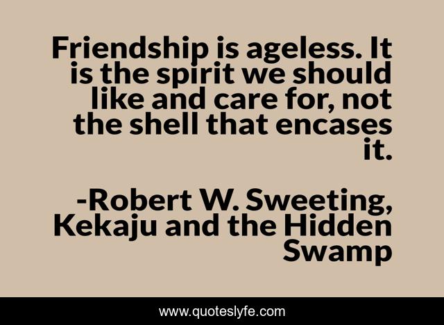 This page presents the quote "Friendship is ageless. It is the spirit we should like and care for, not the shell that encases it.". Author of this quote is Robert W. Sweeting, Kekaju and the Hidden Swamp. This quote is about agelessness, friendship, spirit, life-lessons,.