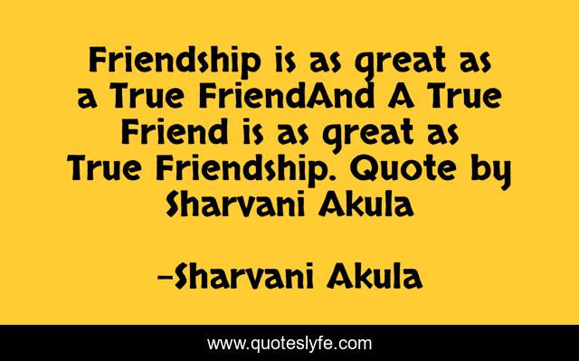 This page presents the quote "Friendship is as great as a True FriendAnd A True Friend is as great as True Friendship. Quote by Sharvani Akula". Author of this quote is Sharvani Akula. This quote is about friendship, greateness-of-true-friend, true-friends, true-friendship,.
