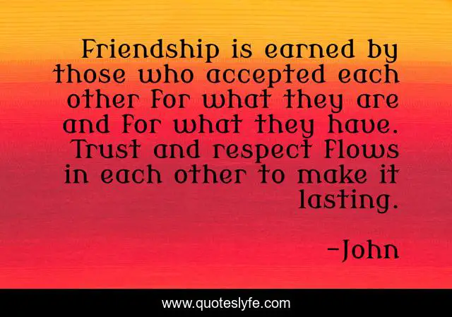 This page presents the quote "Friendship is earned by those who accepted each other for what they are and for what they have. Trust and respect flows in each other to make it lasting.". Author of this quote is John. This quote is about quotes-for-bestfriends, inspirational-friendship-qoutes, inspirational, enthusiasm, quotes-for-friends, friendship,.