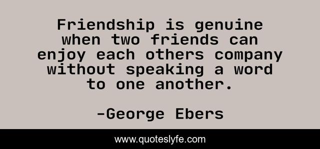 This page presents the quote "Friendship is genuine when two friends can enjoy each others company without speaking a word to one another.". Author of this quote is George Ebers. This quote is about friends, company-you-keep, friendship, speaking, genuineness,.