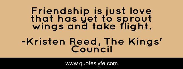 This page presents the quote "Friendship is just love that has yet to sprout wings and take flight.". Author of this quote is Kristen Reed, The Kings' Council. This quote is about love, fictional-character, fiction, romance, fantasy, fantasy-fiction, friendship, affection,.
