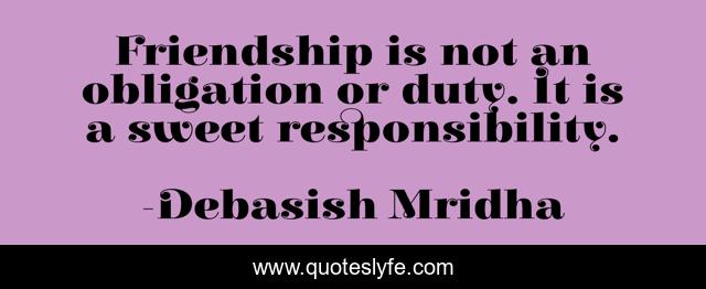 This page presents the quote "Friendship is not an obligation or duty. It is a sweet responsibility.". Author of this quote is Debasish Mridha. This quote is about miraboli, philosophy, debasish-mridha, responsibility, debasish-mridha-md, inspirational, enthusiasm, friendship,.